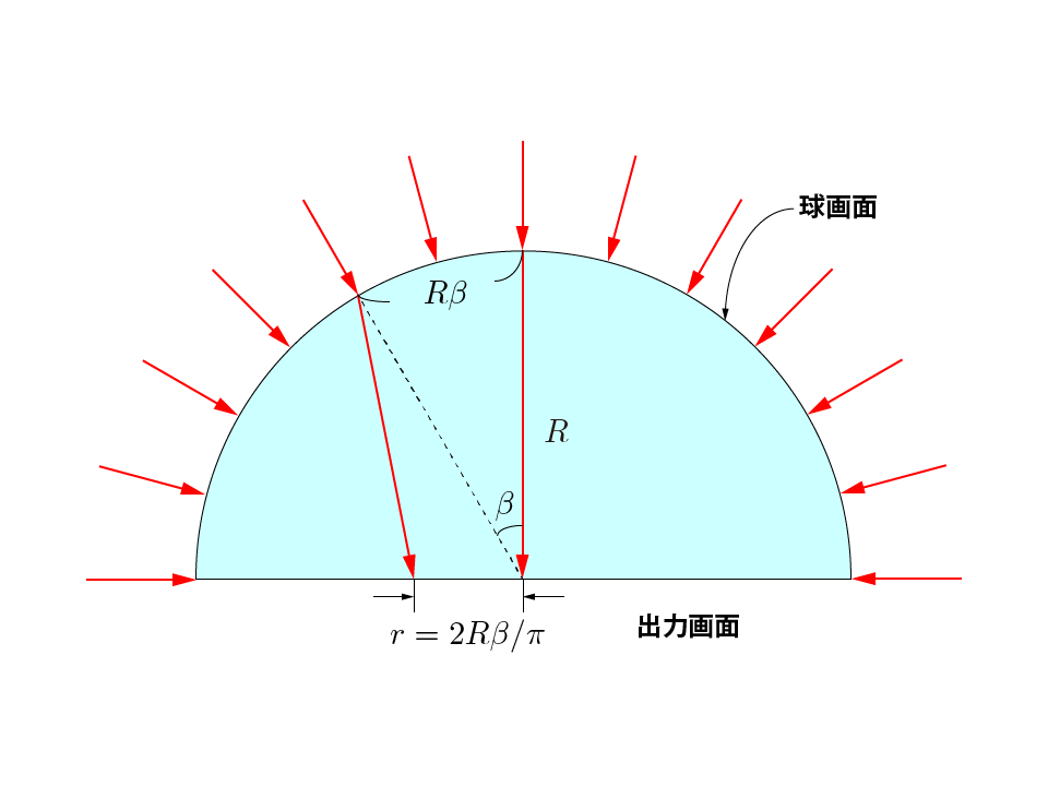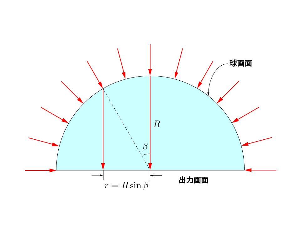 したがって、角度$\beta$で入射した光線は中心から$r = \sqrt{2} R \sin \frac{\beta}{2}$の 地点に射影されます。
