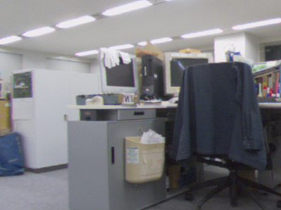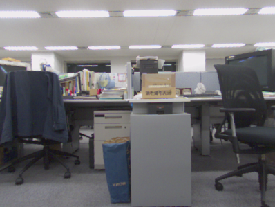 図3に示された円画像の①と②の領域を補正すると、図4と図5のように歪の取れた画像が 得られます。特に蛍光灯の部分を見てもらえればわかりますが、オリジナルの円画像では楕円形に蛍光灯の 並びが歪んでいますが、補正後の画像では、蛍光灯が直線に並んでいます。