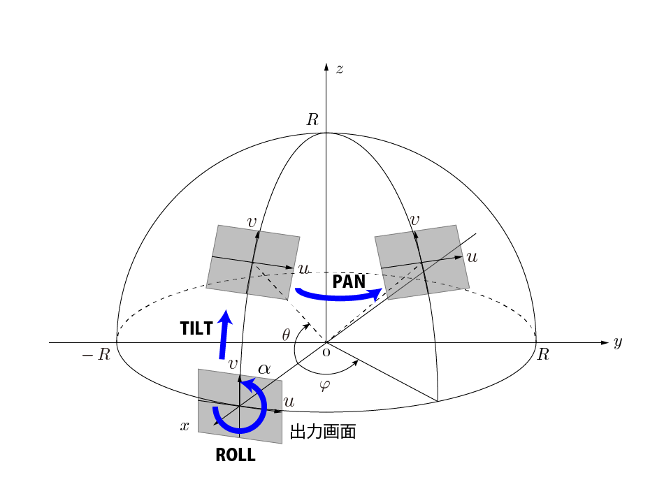 円画像から補正した画像を作るためには、接平面上の点$(u, v)$に対応する円画像上の点$(x, y)$を計算しなければなりません。そのためには以下の手順で計算されます。