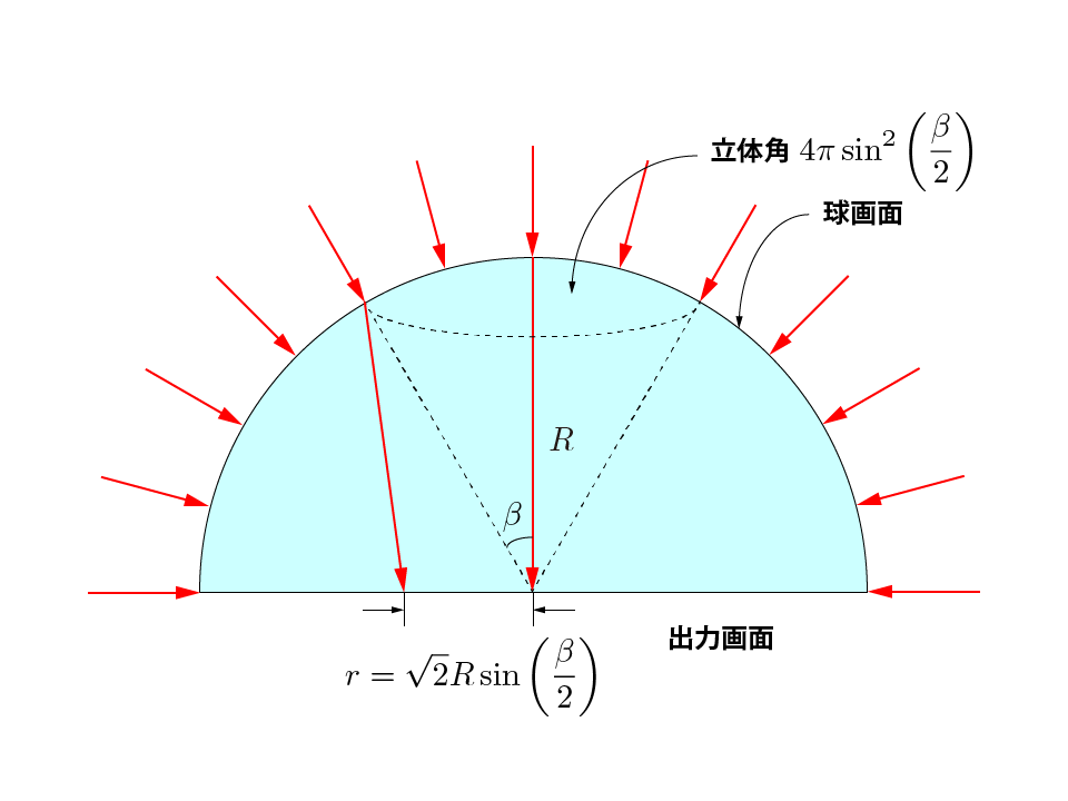 したがって、角度$\beta$で入射した光線は中心から$r = \sqrt{2} R \sin \frac{\beta}{2}$の 地点に射影されます。