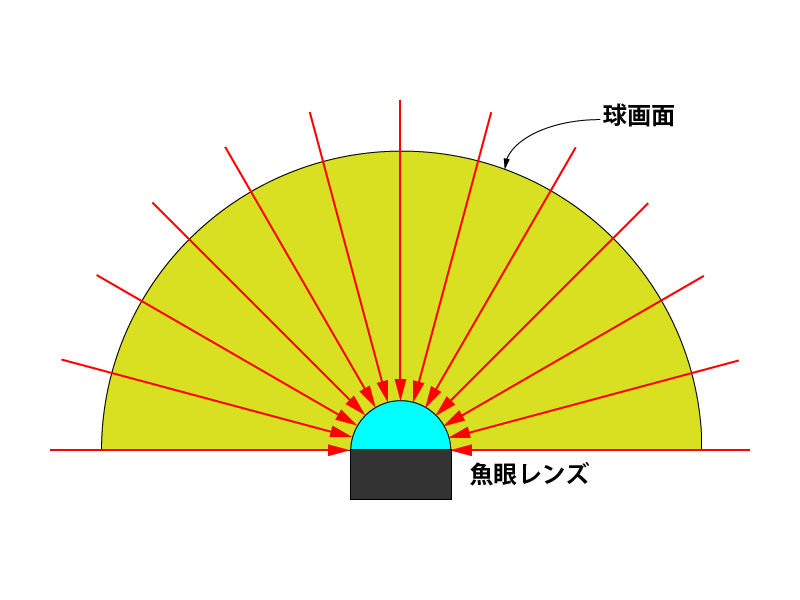全方位カメラは魚眼レンズを使ったカメラで、レンズを中心とした半球面のすべての方向からの 光を取り込んで、CMOSやCCDなどの撮像素子の上で平面画像を結像します。
