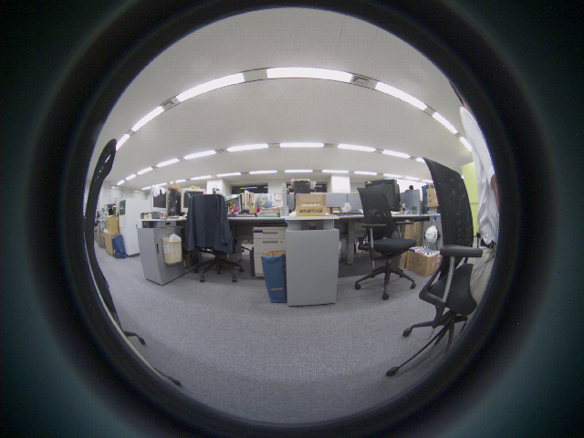 画像を見てお分かりのように魚眼レンズで取り込んだ画像は、円の中心部分では歪みは小さいですが、 円の周辺部分では歪みが大きくなっています。また、本来は直線に並んでいる蛍光灯が、円形に歪んでいます。 このように全方位カメラは魚眼レンズによって、3次元の半球面の画像を2次元の円画像にマッピングして います。そのため、画像は大きく円形に歪むのが特徴です。