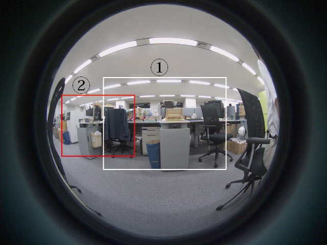 このように円画像のままですと、歪があるので人間にとっては見にくい画像となっています。したがって、 全方位カメラには画像を補正する機能を備えたものもあります。この場合、歪んだ円画像を一気に補正するのは 困難なので、特定の領域を切り出して補正します。