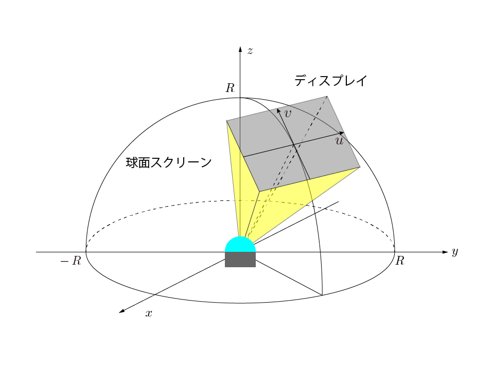 - 接平面の接点を球面スクリーン上を移動したとき、接平面上の点$(u, v)$の3次元空間上での座標 $(x', y', z')$を計算します。