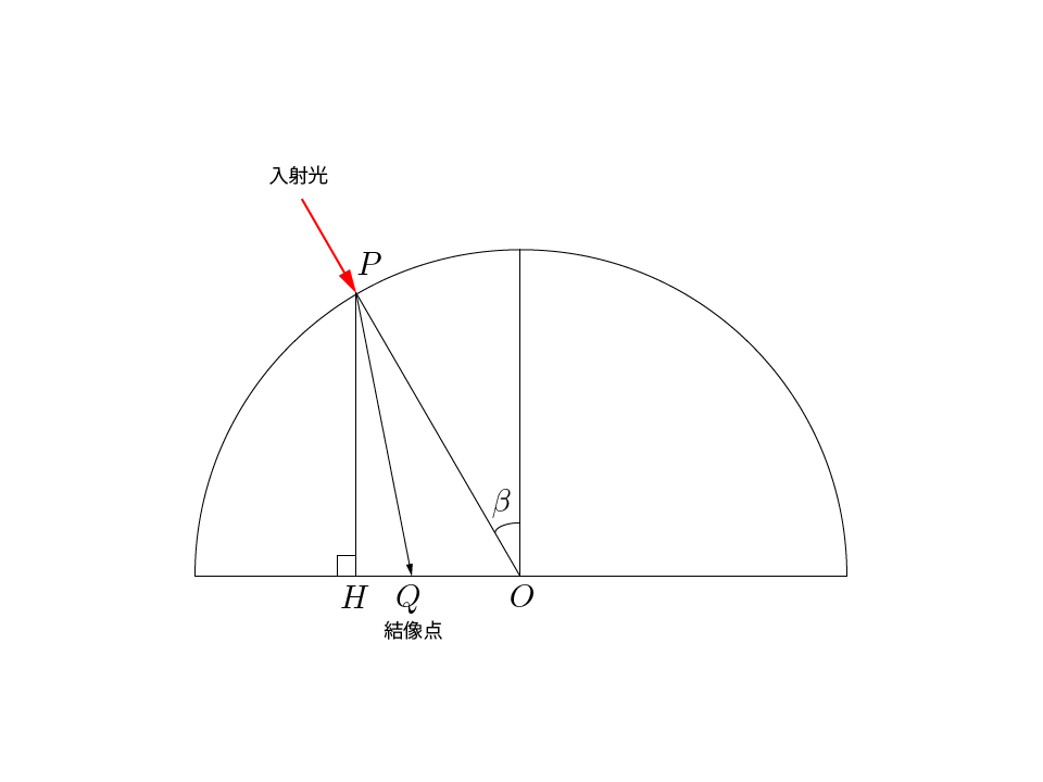 \[ \beta : r = \pi / 2 : R \]したがって、角度$\beta$で入射した光は、円の中心から$2R \beta / \pi$の地点に結像します。